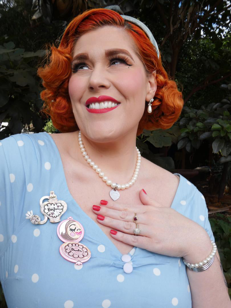 Calling all glamour gals and vintage vixens! Unleash your inner Hollywood icon with this "Glamour in a Bottle" brooch by Asia Ellington, brought to life by Lipstick & Chrome!